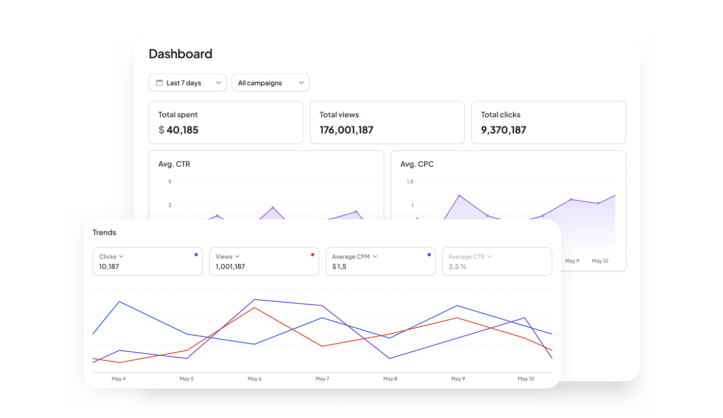 Use the dashboard to monitor impressions, clicks, spend, and performance